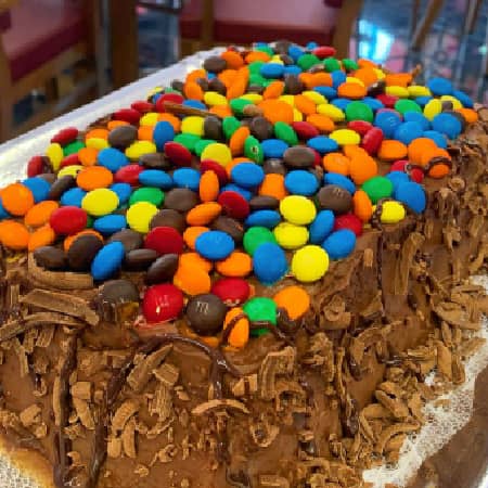 Massa de chocolate, recheio de brigadeiro e trufa. Cobertura de ganache e MM’S.