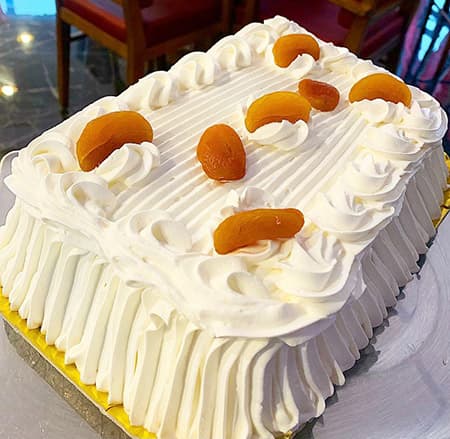 Massa branca com recheio de creme de leite condensado com geleia de damasco, cobertura de marshmallow, damasco e calda de caramelo.