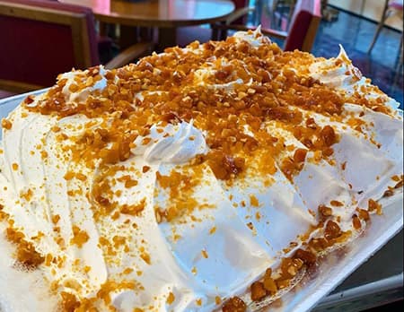 Massa branca com recheio de creme de leite condensado e crocante. Cobertura de chantilly ou marchmelow com crocante por cima.