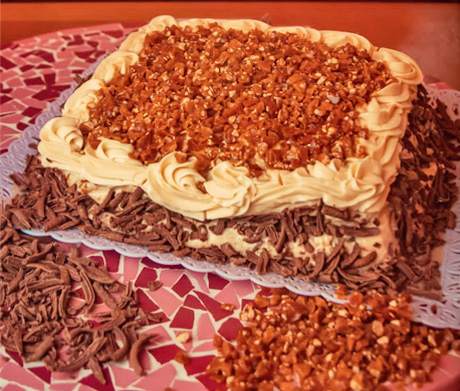 Crocante Especial Massa de chocolate com recheio de creme de baunilha e crocante de caju, massa branca com recheio de brigadeiro mole, massa de chocolate com cobertura de creme de baunilha e crocante.