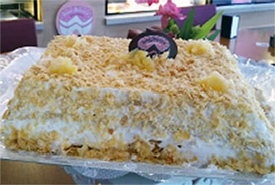 Pão de ló com creme de leite condensado e frutas a escolher (pêssego, ameixa, abacaxi, morango, nozes ou castanha, massa folhada com cobertura de chantilly e calda a escolher.