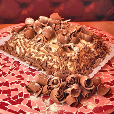 Massa de chocolate e branca, recheio de Nutella, cobertura de creme de Leite Ninho branco com raspas pretas ou brancas.